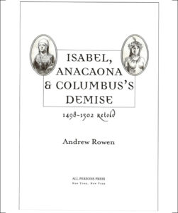 A historical novel, Isabel, Anacaona & Columbus’s Demise: 1498–1502 Retold dramatizes from both Native and European perspectives the European subjugation of Española’s indigenous peoples during the least studied period of the island’s brutal conquest. Based on primary sources, it strikingly sets a Native and European queen—the Taíno Anacaona and Spain’s Isabel—on comparable pedestals and tells Columbus’s demise through his eyes and those of Taíno chieftains and Spaniards who opposed him.